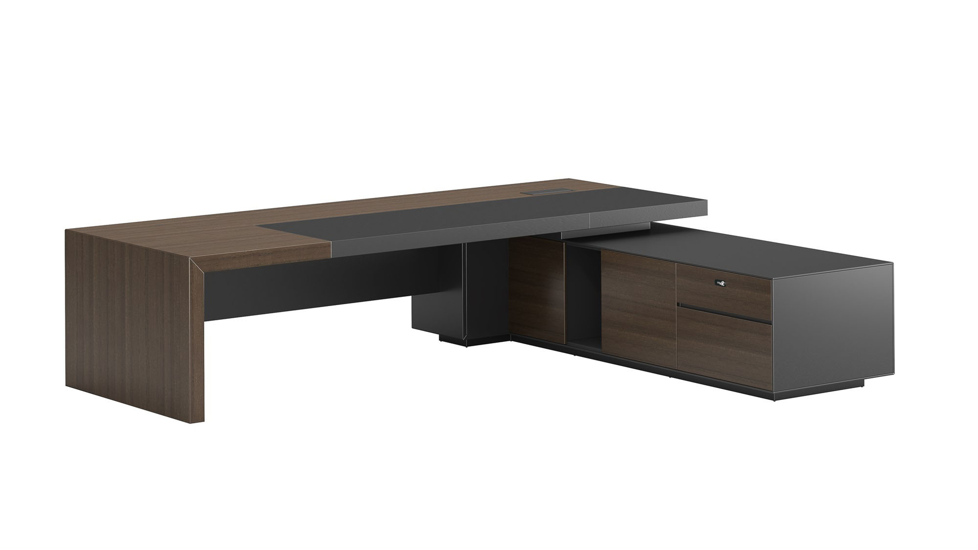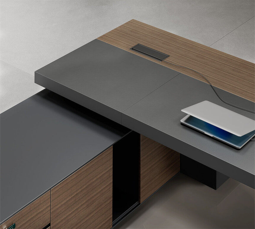 明哲系列辦公家具,采用直紋胡桃和星空灰實(shí)色漆元素,高檔實(shí)木質(zhì)感飾面,深邃飽滿,紋理清晰,內(nèi)蘊(yùn)深厚。搭配簡(jiǎn)約端正的造型設(shè)計(jì),臺(tái)腳的斜切裝置,還有產(chǎn)品的布局變化,錯(cuò)落有致,承前啟后,展現(xiàn)極致簡(jiǎn)潔和視覺(jué)效果的完美詮釋。低調(diào)又不失時(shí)尚,穩(wěn)重又不失靈動(dòng),既營(yíng)造現(xiàn)代時(shí)尚的情緒,還給當(dāng)今辦公環(huán)境注入明亮、輕松的舒適感。